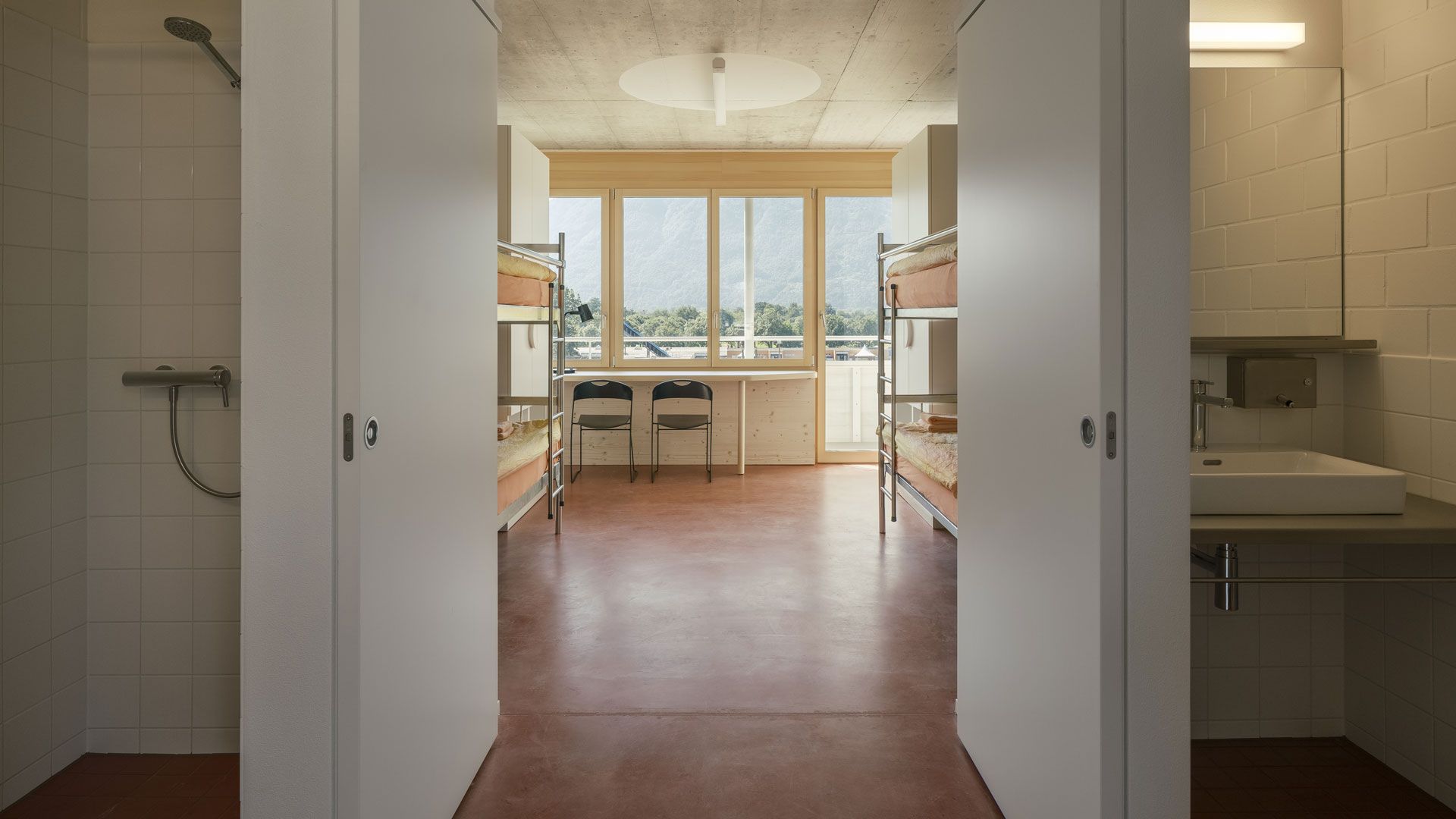 «Die Unterkunft wurde so konzipiert, dass sich die Gäste wie zu Hause fühlen», erklärt die Projektleiterin Sabine Bachmann. Das fünfstöckige Gebäude verfügt über unterschiedlich grosse Zimmer, die auf vier Etagen verteilt sind. Die ersten beiden Etagen verfügen über drei Vierbettzimmer, sechs Doppelzimmer und vier Einzelzimmer. Auf dem dritten und vierten Stock befinden sich vier Vierbettzimmer, vier Doppelzimmer und sechs Einzelzimmer. Die Einzelzimmer jeder Etage können auch als Doppelzimmer genutzt werden. Je ein Zimmer im ersten und zweiten Stock ist für Personen mit eingeschränkter Mobilität konzipiert – somit ist die Barrierefreiheit gewährleistet. Ein eigenes Bad (WC und Dusche) und ein kleiner Balkon pro Zimmer sorgen für einen komfortablen Aufenthalt. Jede Etage ist mit einem Raum für Gruppenaktivitäten ausgestattet. Im Erdgeschoss befinden sich Technik- und Lagerräume, Sitzungszimmer, ein Raum für die Aufbewahrung von Sportausrüstungen sowie ein Waschraum mit zahlreichen Waschmaschinen und Trocknern. Nachhaltigkeit ist bei der Unterkunft Dono nazionale svizzero auch ein Thema. Die Betten stammen vom Militär und können nun wiederverwendet werden.