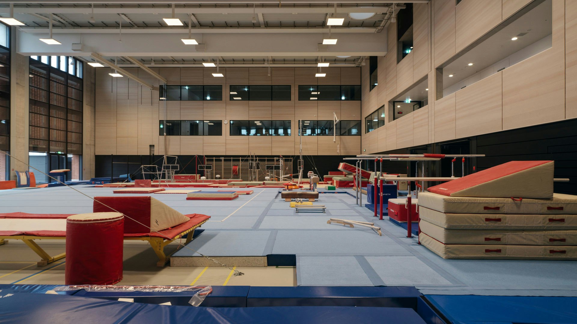 Doppelhalle mit festen Geräten für Kunst- und Geräteturnen.