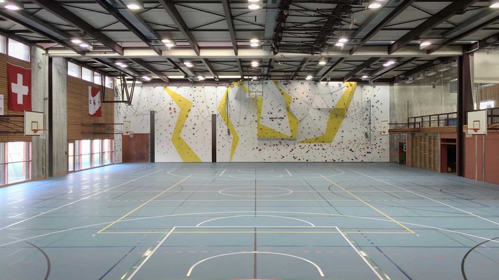 Salle de sport triple avec revêtement en polyuréthane, équipée de murs de séparation. Une galerie est aménagée pour la pratique de sports tels que l’escrime, le tennis de table et les sports de combat.