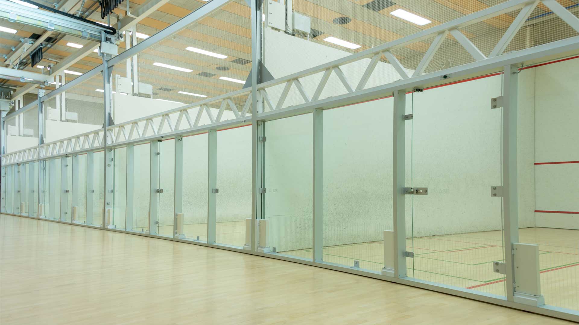 Palestra con pavimento in parquet predisposta per la pratica dello squash (4 campi). La struttura è utilizzabile anche come palestra standard grazie alle pareti modulabili.