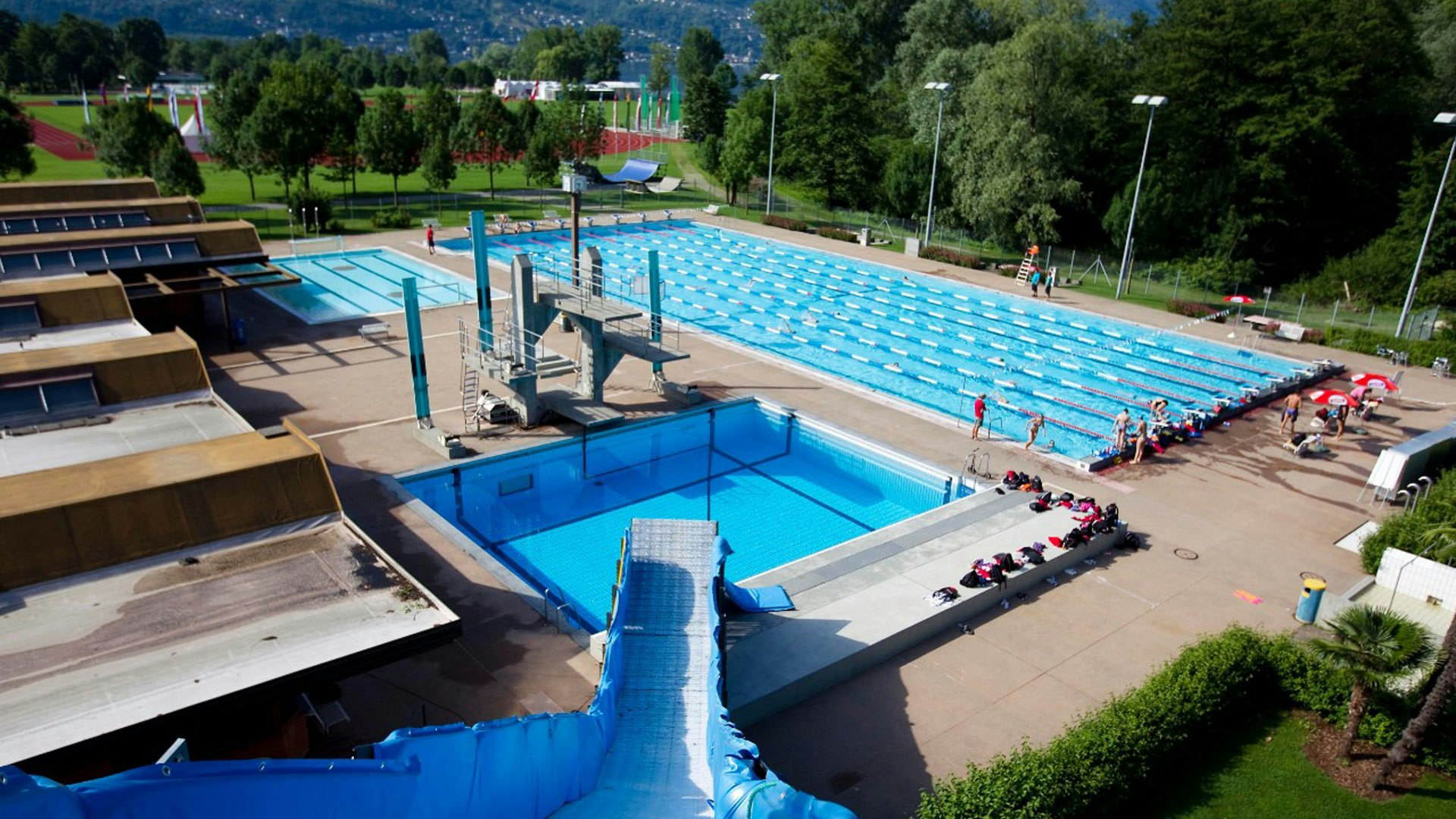 - una piscina per tuffi (con trampolini da 1, 3 e 5 metri; trampolini da 1 e 3 metri per i tuffi sincronizzati; una rampa per il salto acrobatico con gli sci, profondità: 400cm).